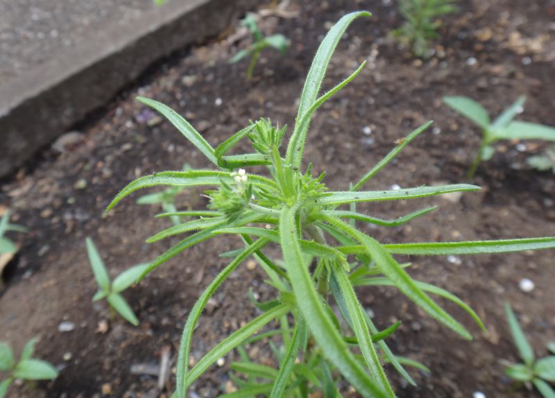 葉は狭被針形で、葉腋に小さいかすかに淡紅色をおびた白い4弁花を