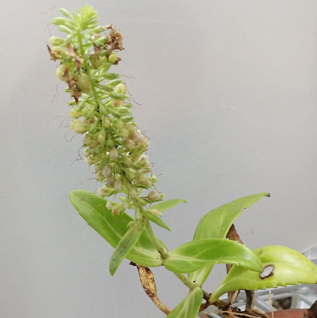 葉は細長いへら形で、長い花茎の先に小さな花を穂状に下から上へと