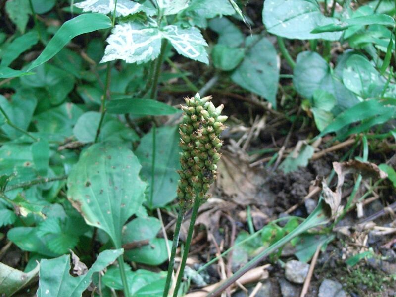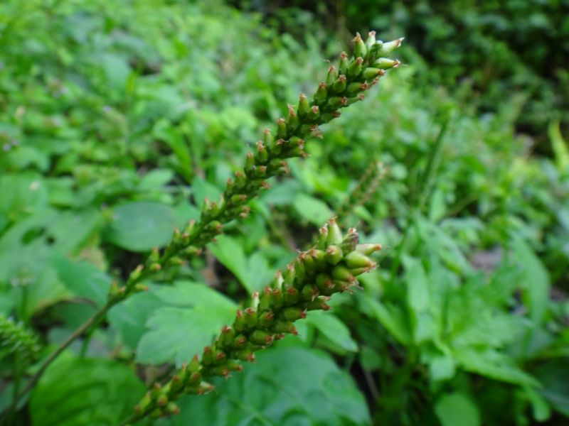 根から立ち上がる数本の花茎の先に淡緑色の小さな花を穂状に密につけ、