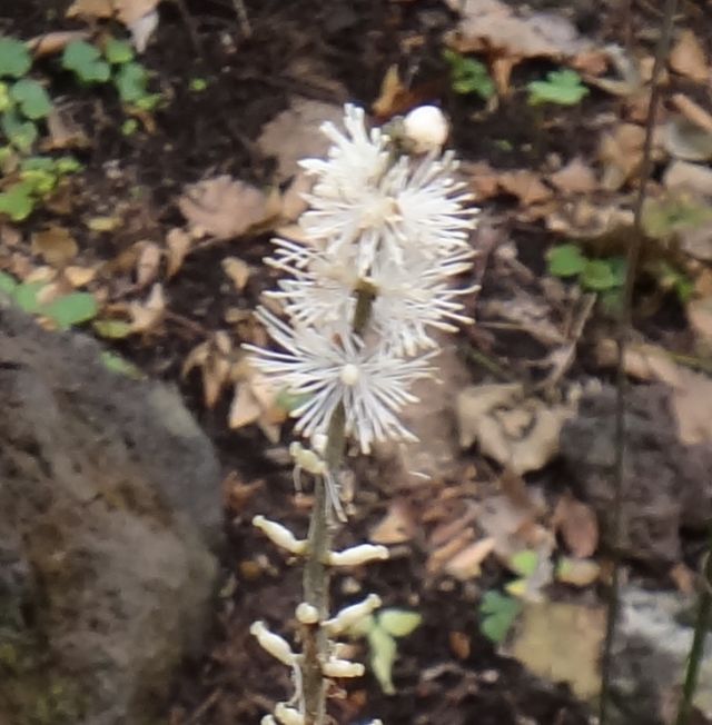 花序は白い雄しべがビン洗いブラシのように並んだ形。先端の丸いのは蕾。