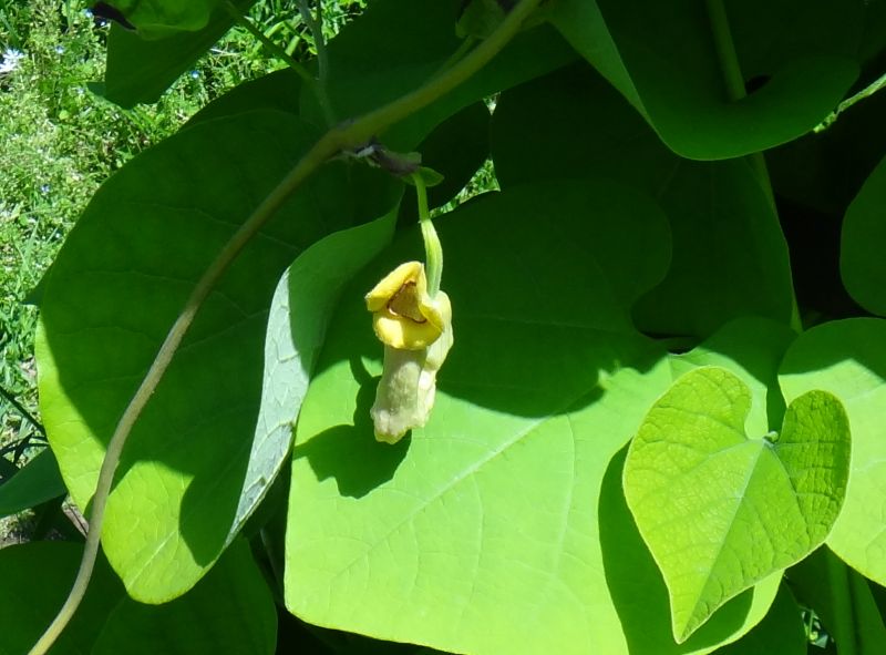 オオバウマノスズクサ:葉は大きな円心形〜三角状卵形、花はサキソフォン形で黄色、刮ハは大きい稜のある長楕円形。