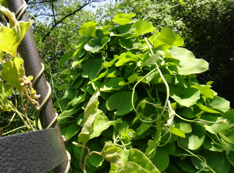 大きな円心形の葉がしげる。つるはまきついたり絡んだりする。