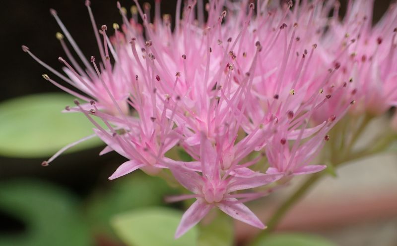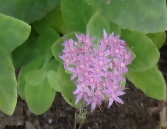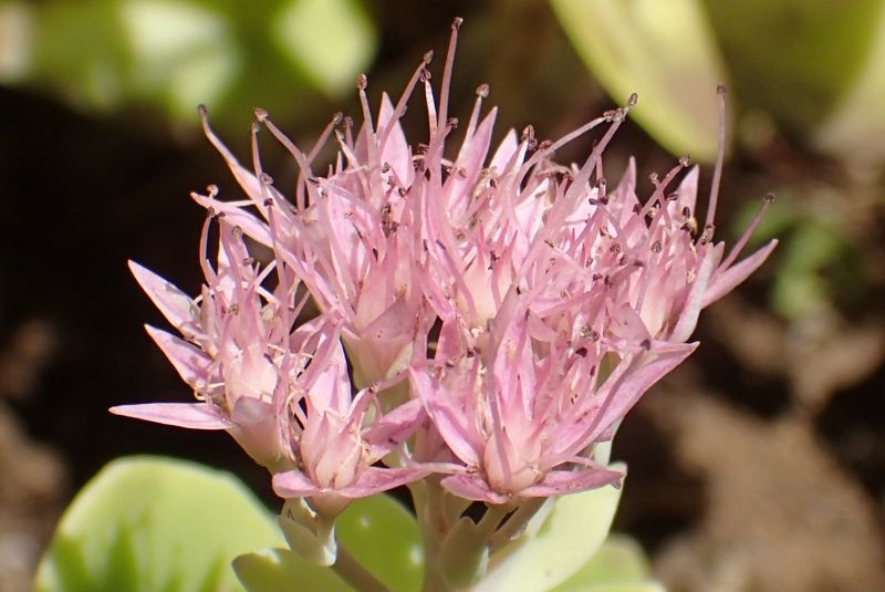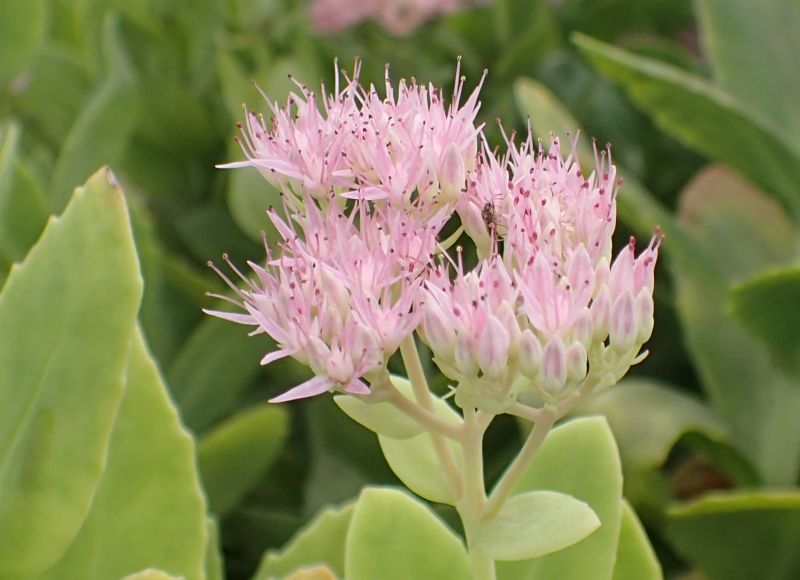 ベンケイソウ-中国渡来種:葉は対生、花は淡紅色、雄しべは花弁より短い。下部の花序枝が長い。