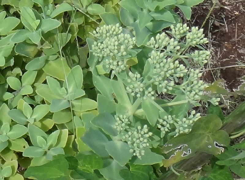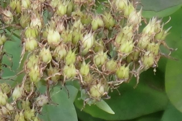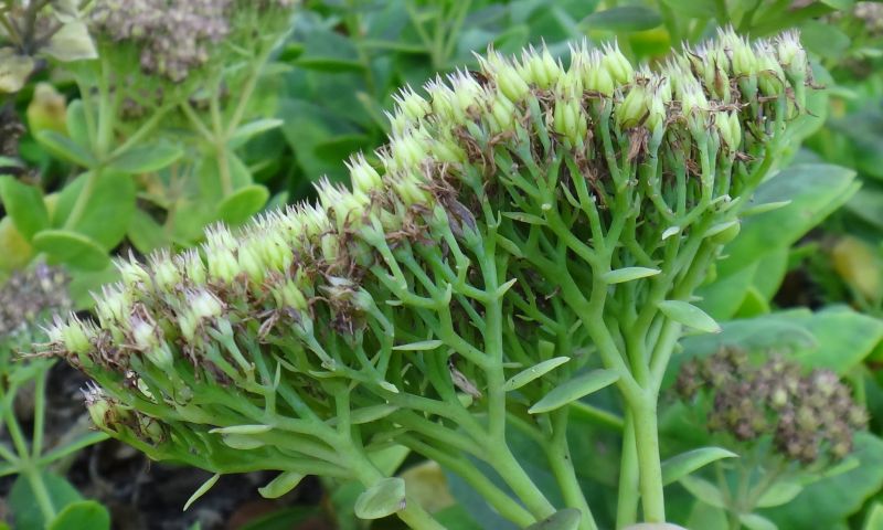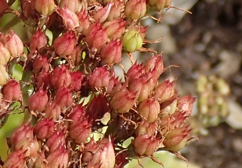 ベンケイソウ-日本自生種:葉は互生、花は黄緑色、雄しべは花弁より短い。下部の花序枝は短い。