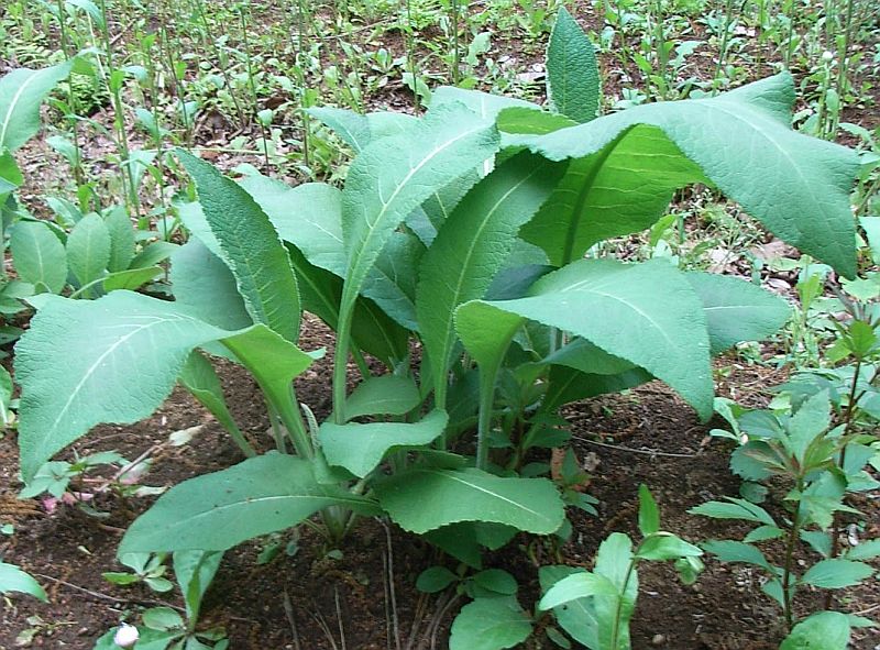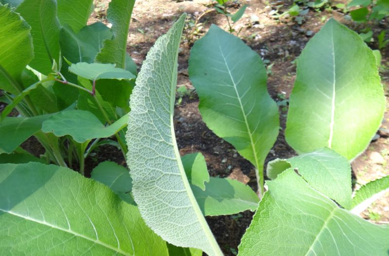 下部の葉は大きな楕円形で鋸歯があり、軟毛がある。