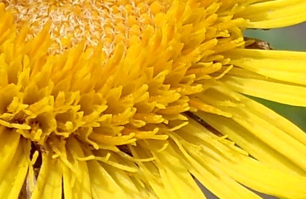 舌状花も筒状花も多数あり、花全体が黄色く、舌状花は細長い。(2017/6/24)