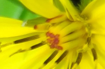 雄しべは黒褐色の筒状で、その中から(雌しべの)柱頭が出る。柱頭の先は2裂する。
