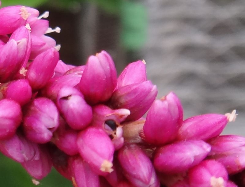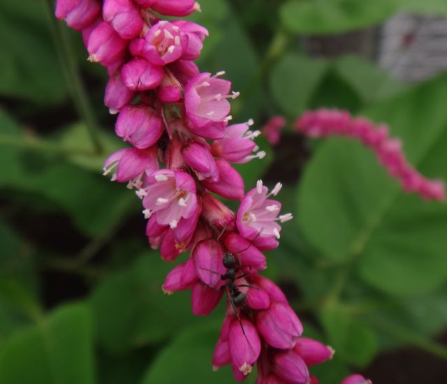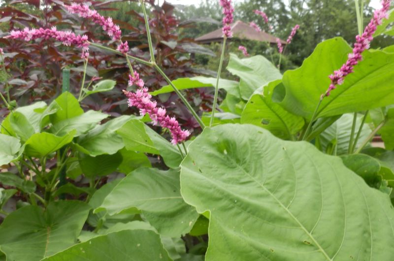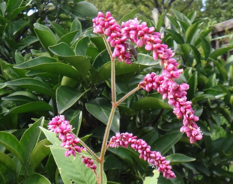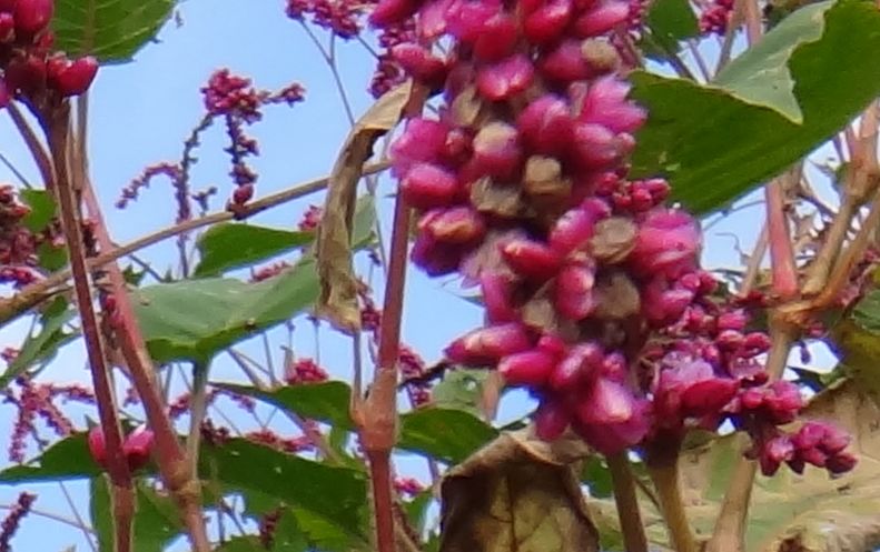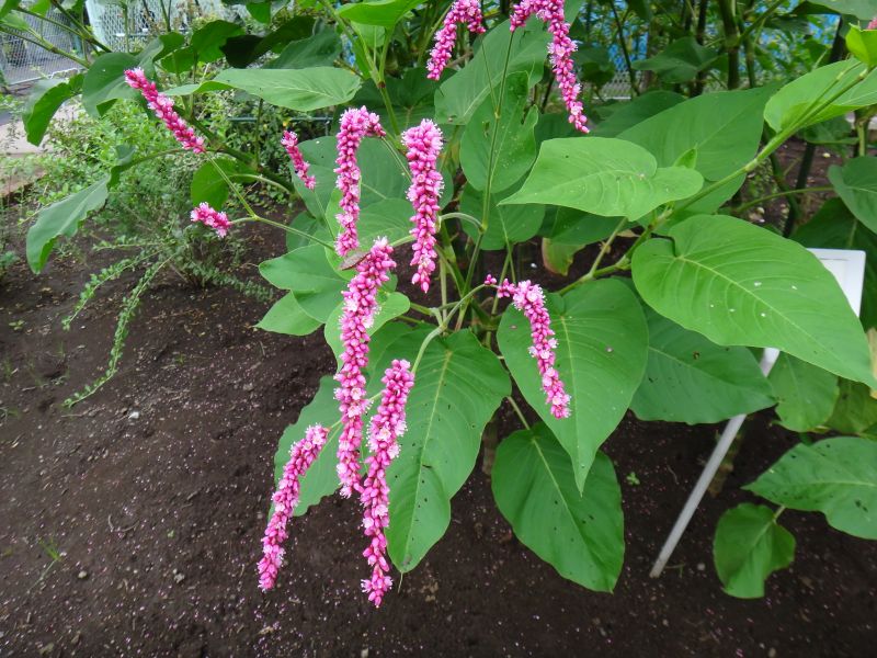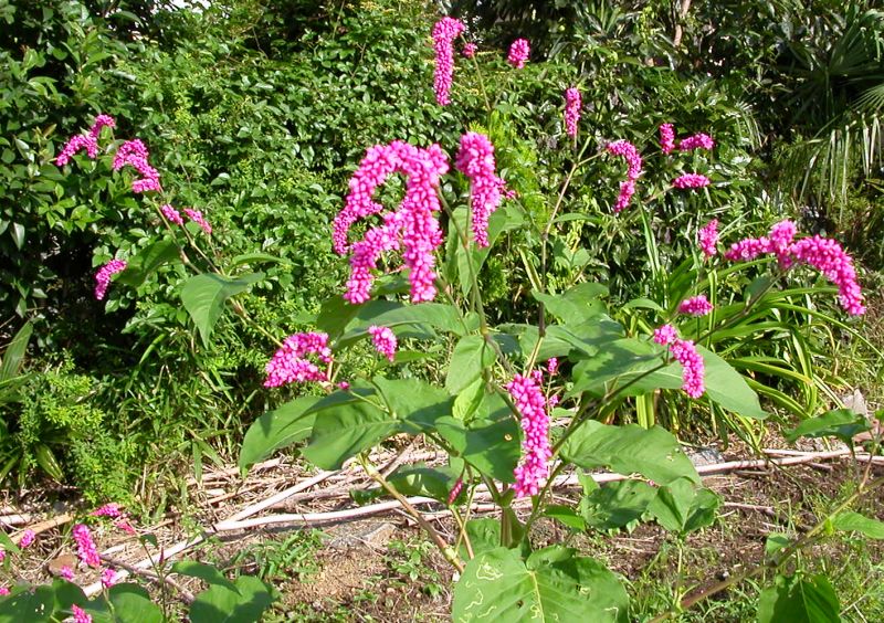 オオベニタデ:1.5メートル位で、花は濃紅色、穂は5〜10センチで垂れ、葉は広卵形で先は少しとがる。
