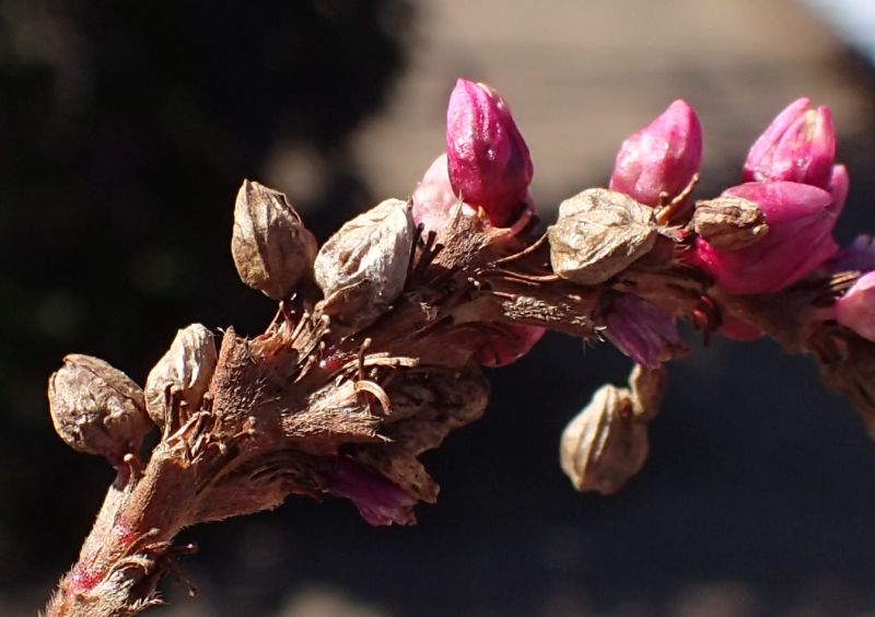 白色の混じった薄紅色の5裂する萼を持つ米粒大の花を密集してつける。