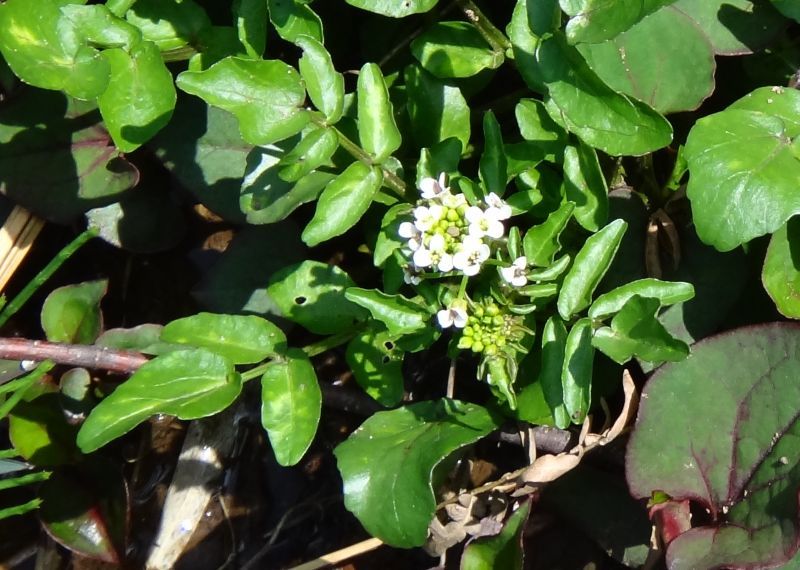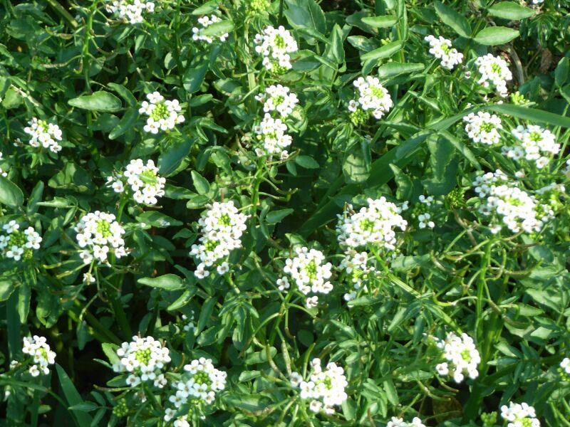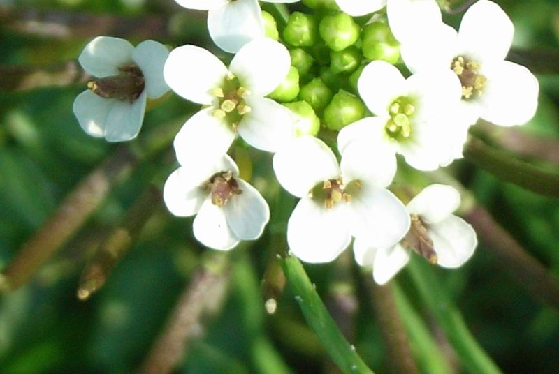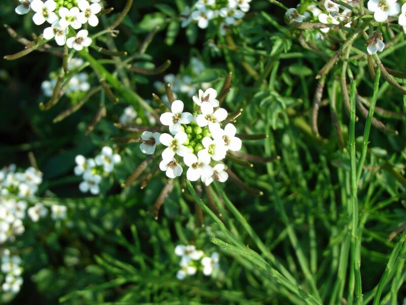 直径6ミリぐらいの白い4弁花を密集して咲かせる。