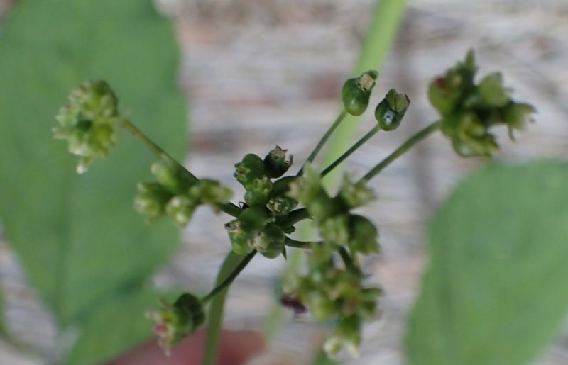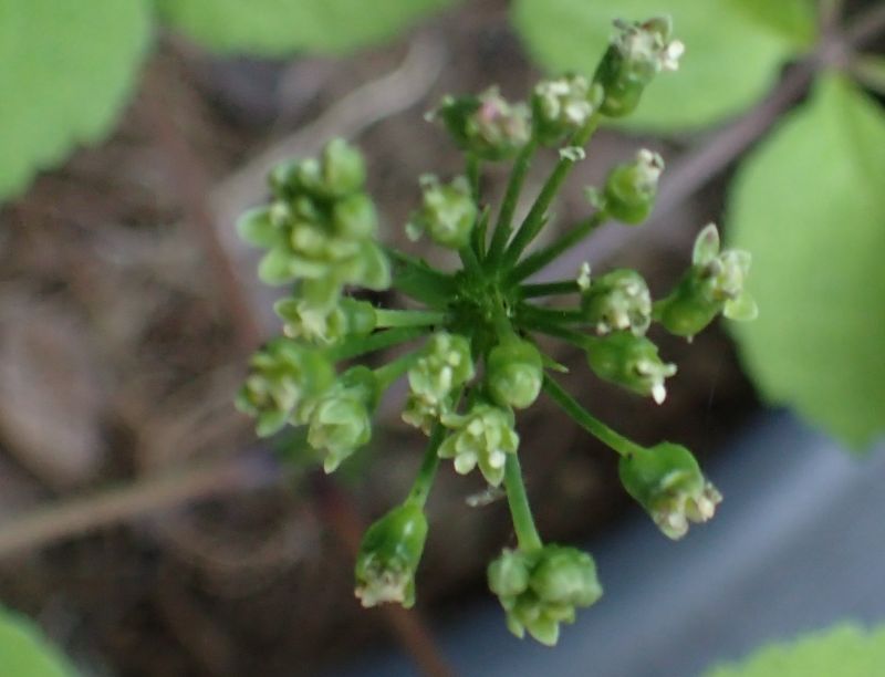 その先の散形花序に淡黄緑色の小さい花が多数咲く。