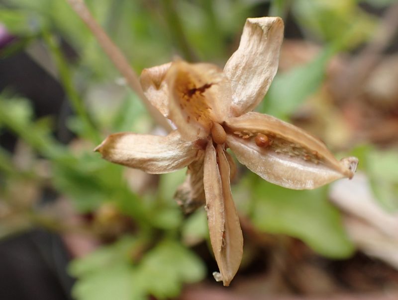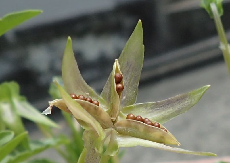 3つに裂開すると、淡褐色の丸い種子が現れる。