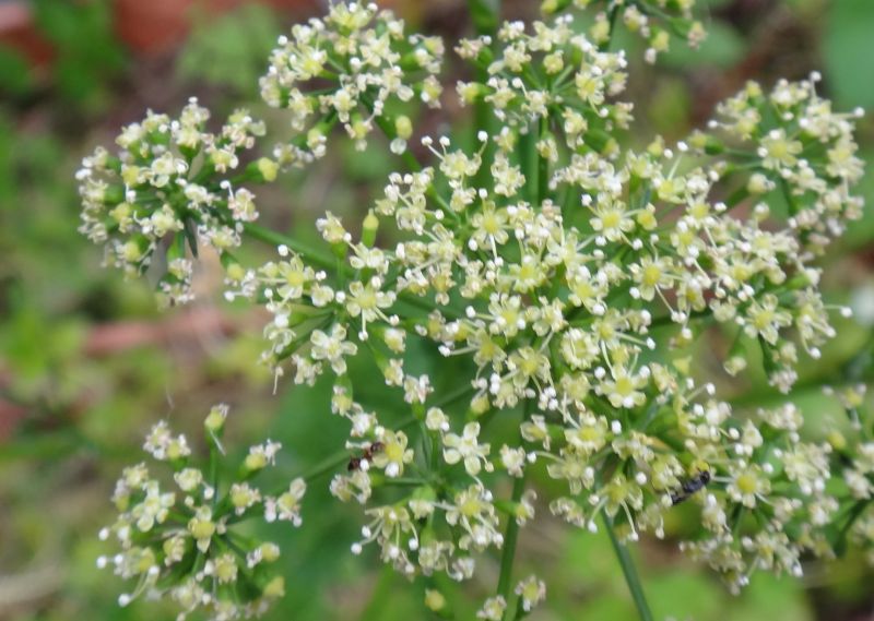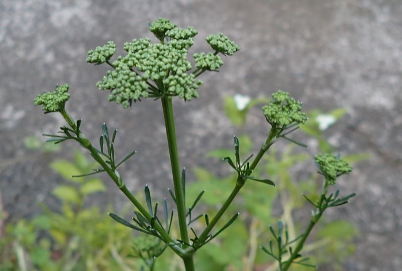 直立した太い茎が枝分かれし、枝先の複散形花序に、