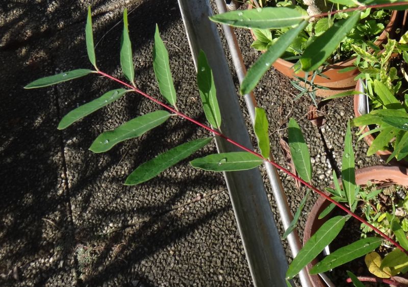 葉は長楕円形で対生する。茎も赤い。