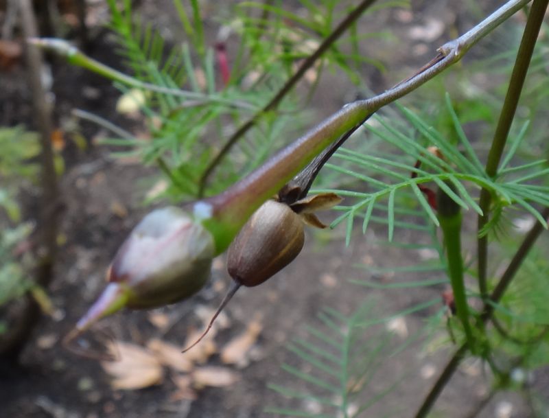 ルコウソウ :葉が羽状に裂けて裂片が糸状、果実は帽子形。