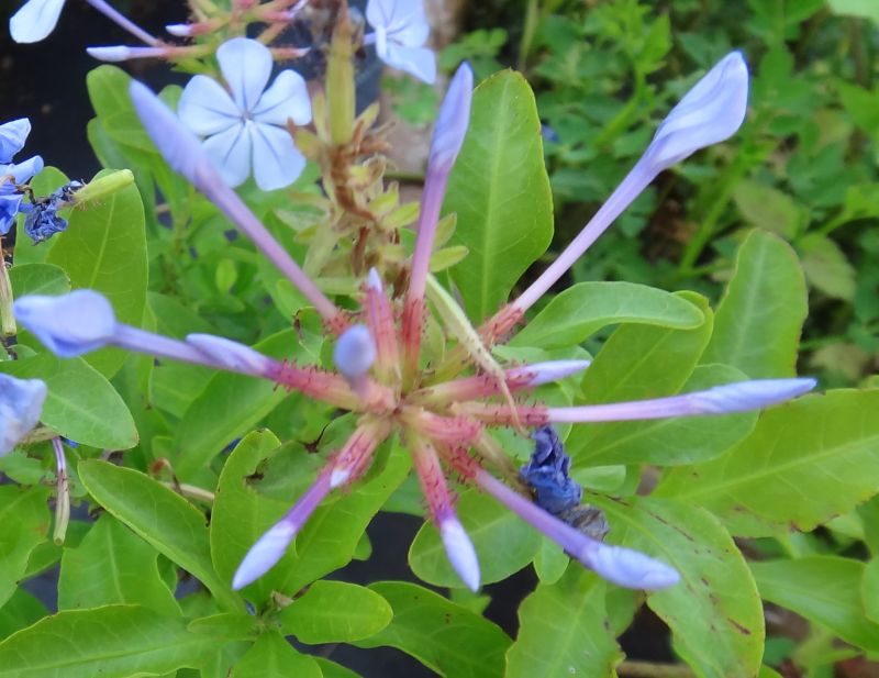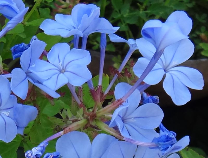 青色〜淡青色で直径2〜3センチの高坏状の5弁花をまり状に多数つける。