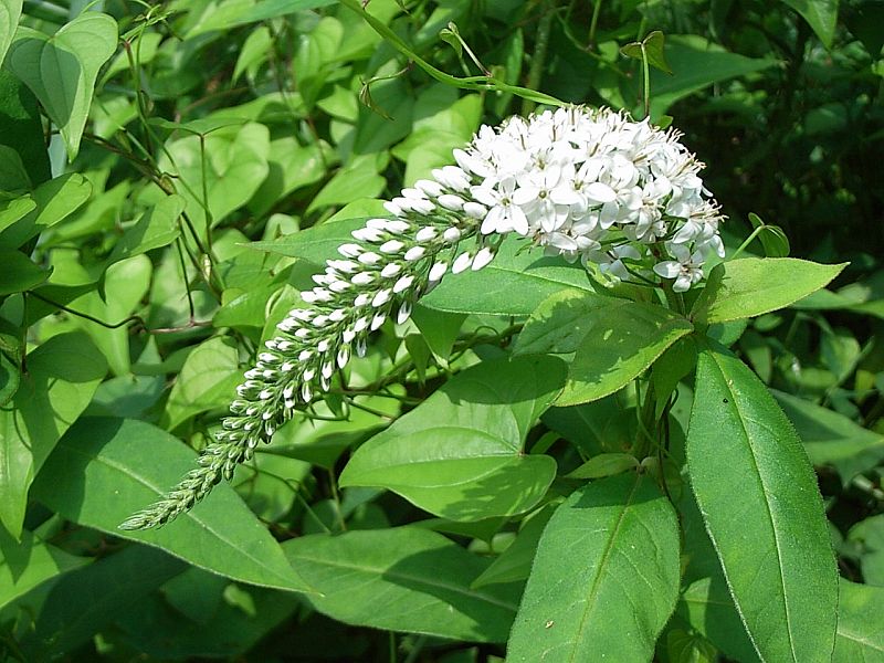 茎先に途中からたれさがり先が細くなる房状花序を出し、白い花を多数つける
