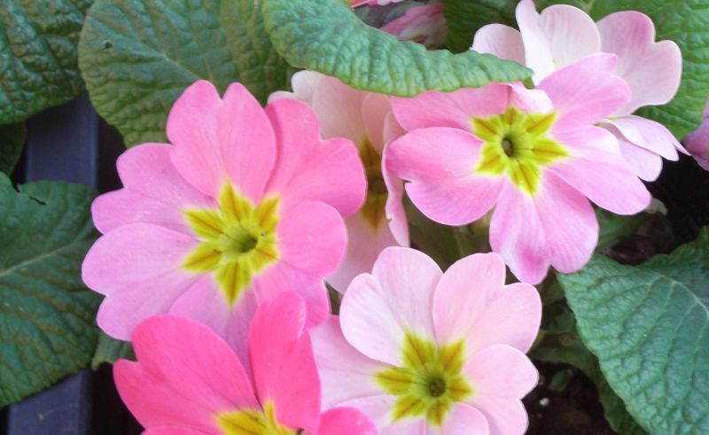 プリムラ :花期12〜5月、高さ15〜40センチ、葉柄がある、花は散形状に咲く、花の中心部が黄色。