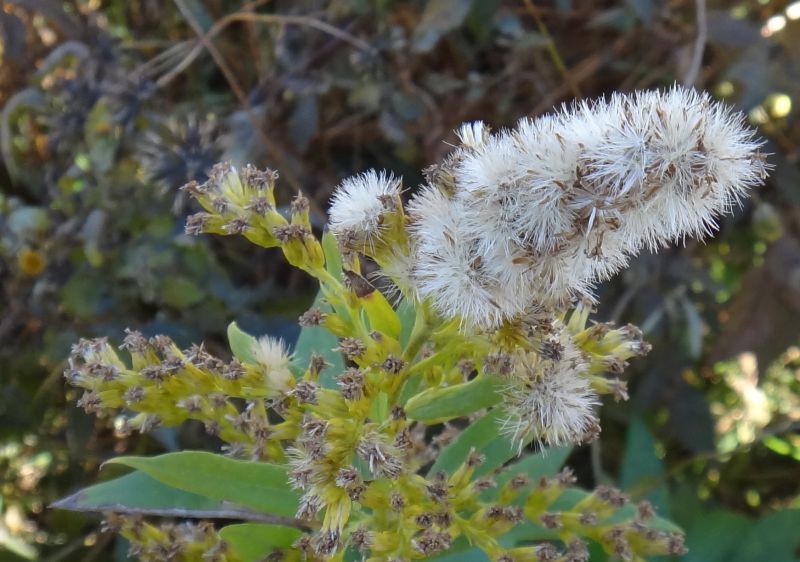 各頭花には、4つぐらいの筒状花のまわりに、細長い花弁を1枚もつ舌状花が10個ぐらいあるようだ。(2016/10/11)
