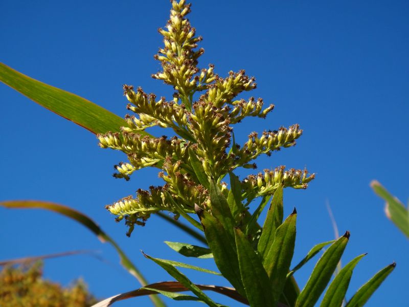 茎は直立して2メートルぐらいになり、黄色い円錐花序をつける。