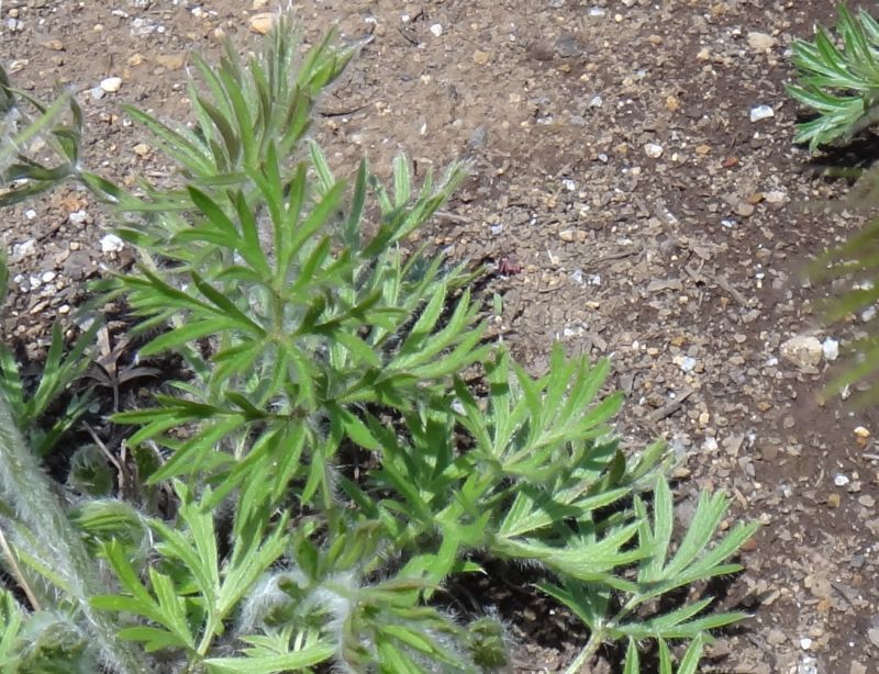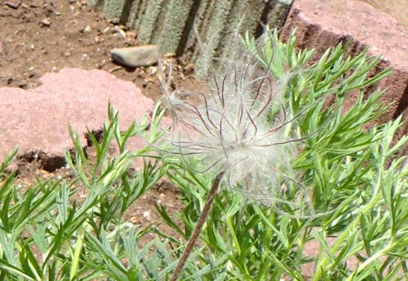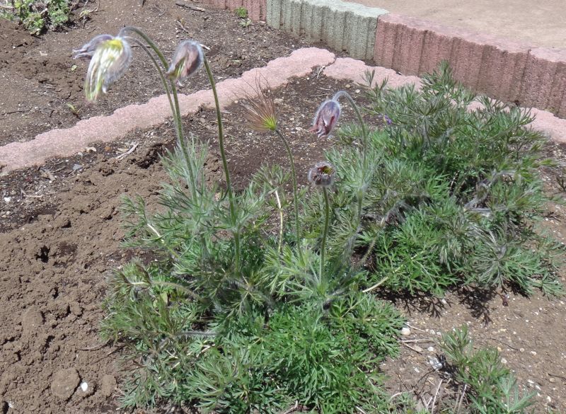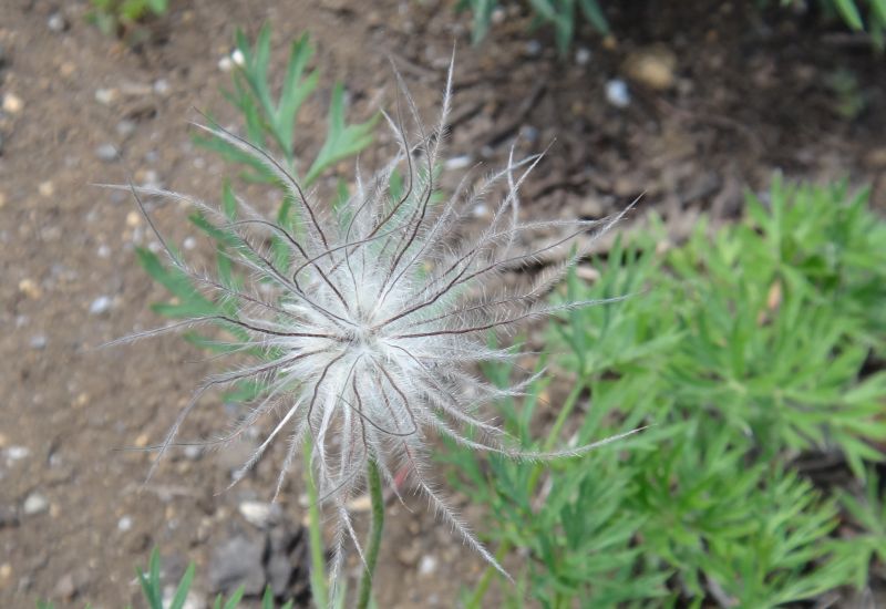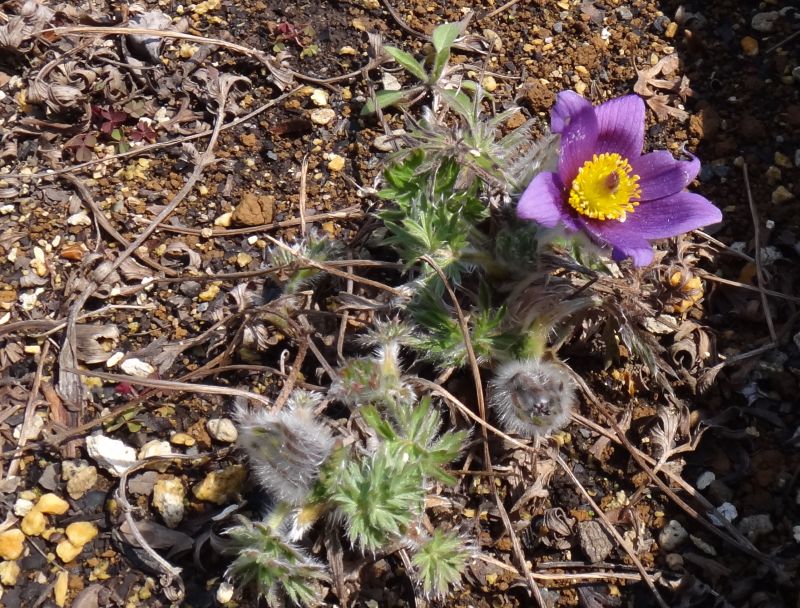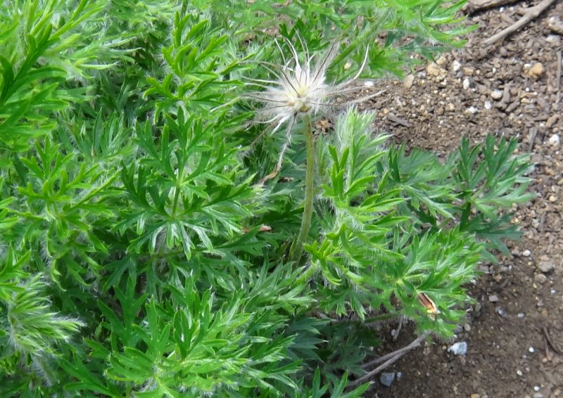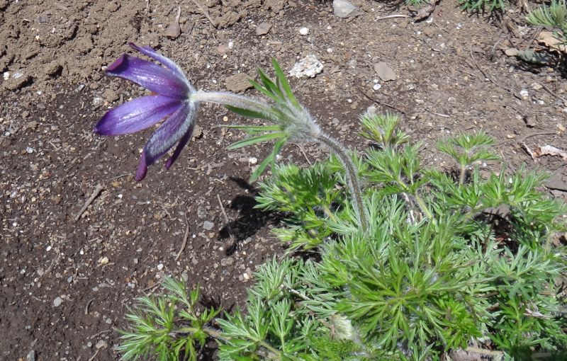 セイヨウオキナグサ:花茎5〜6センチ、花上向き。