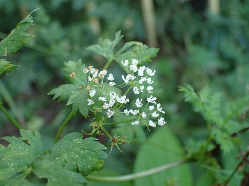 茎先の複散形花序に白い5弁花を多数つける。