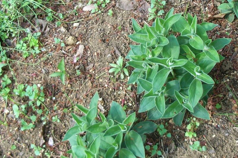 葉は広披針形で対生し、葉柄はなく、細毛が密生する。