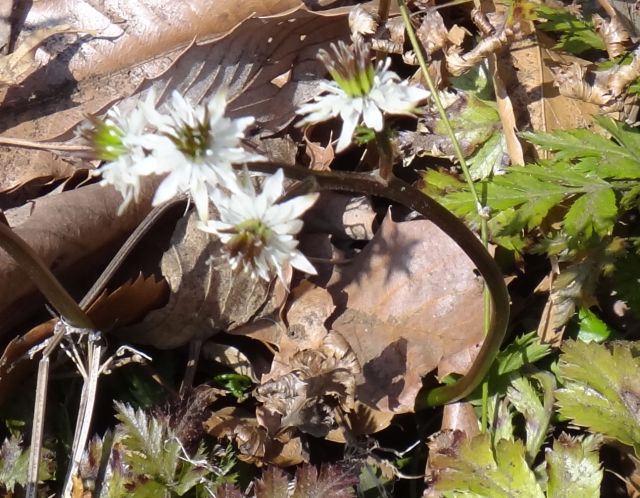 地中からのびた花柄の先に直径1センチぐらいの白い花を3個ぐらいつける。