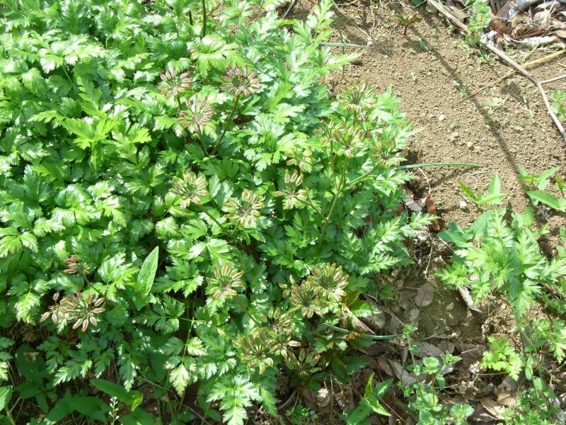 葉はすべて根生葉で、2回3出複葉であり、小葉はセリの葉のように深裂する。