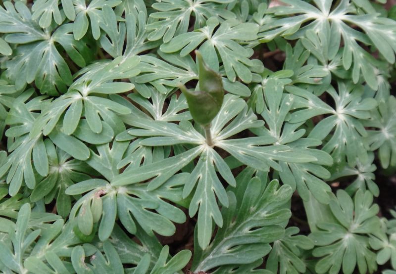 根生葉は掌状で3深裂し、裂片はさらに裂ける。(2016/4/15)