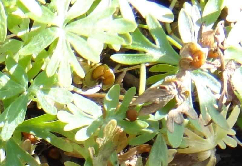 袋果から直径2.5〜3ミリの褐色でいびつな玉状の種子がこぼれ落ちる。