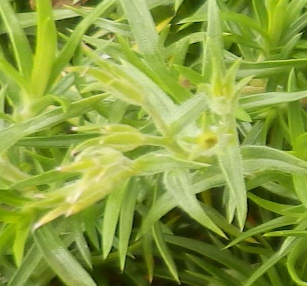 葉は対生し、長さ約2センチの小さい披針形で、固い。葉裏に毛がある。