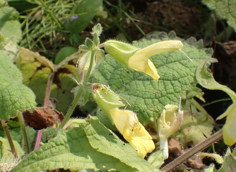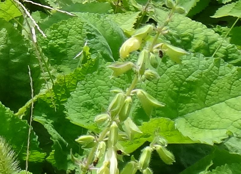 茎先の穂状花序に淡黄色の唇形花がつき、形はサルビアに似ている。