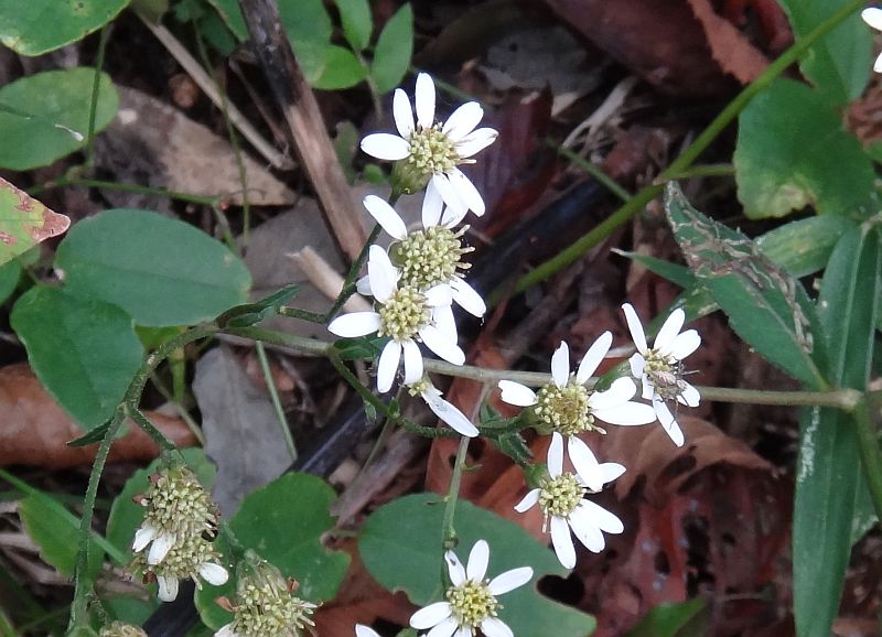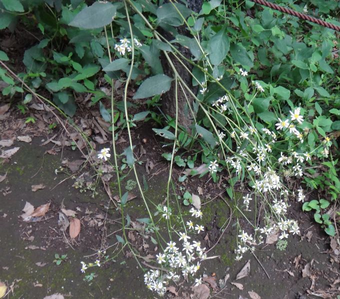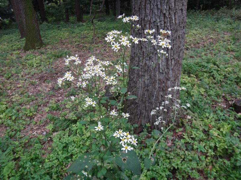 シラヤマギク:下葉は柄が長い心形、上葉は小さい被針形で、6〜8枚の白い舌状花が不等間隔に並び、筒状花は白っぽく、総苞片が3列に並ぶ。