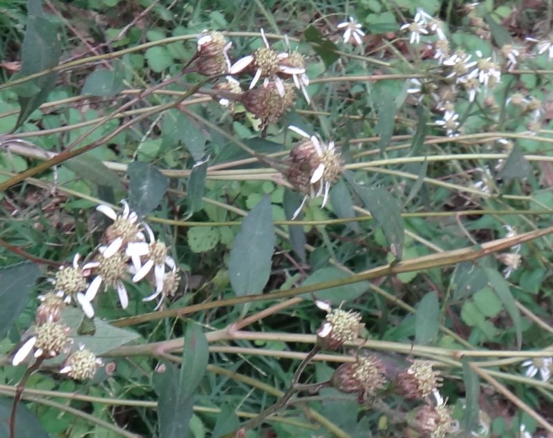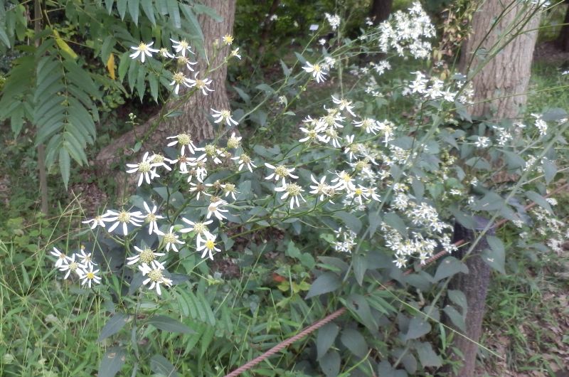 シロヨメナ:茎は直立し、葉は鋸歯のある長楕円状被針形で先がとがって光沢があり、基部はくさび形で、舌状花は白く総苞は筒状。