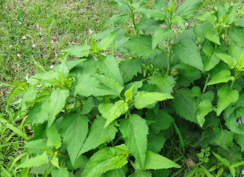 若葉の頃の茎葉は尖った卵形で鋸歯があり、互生する。