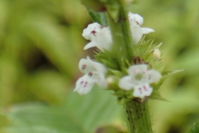 葉腋に長さ約5ミリの白い唇形花が群がる。