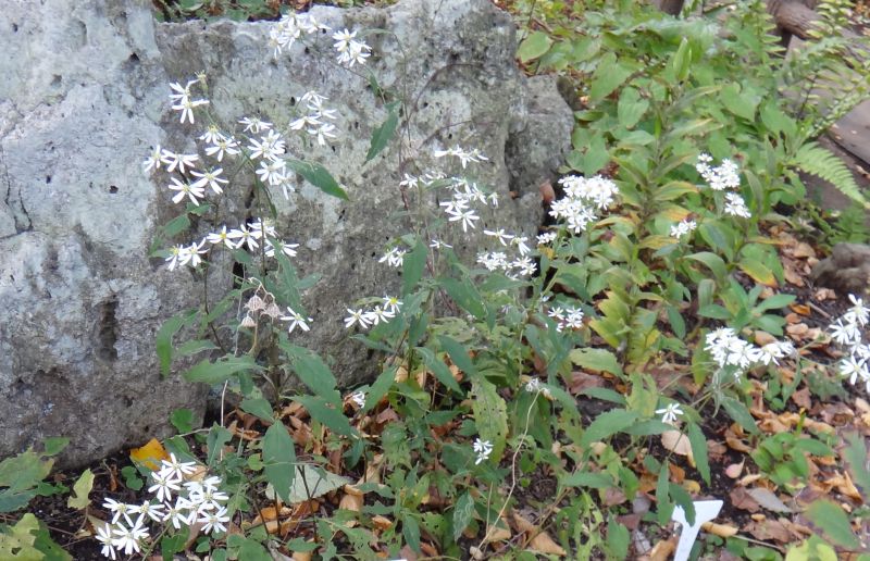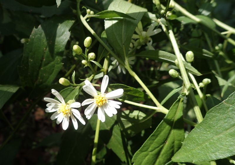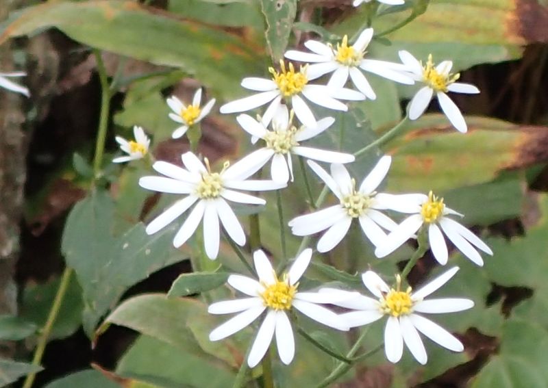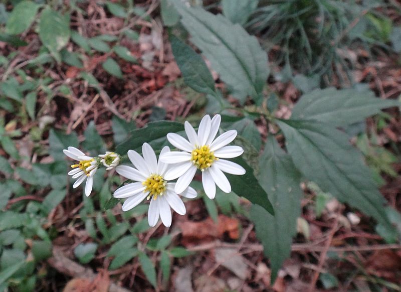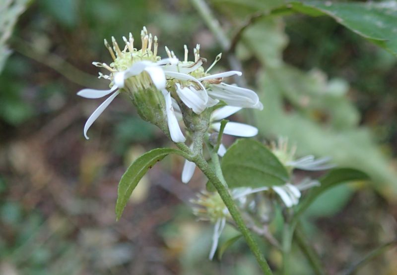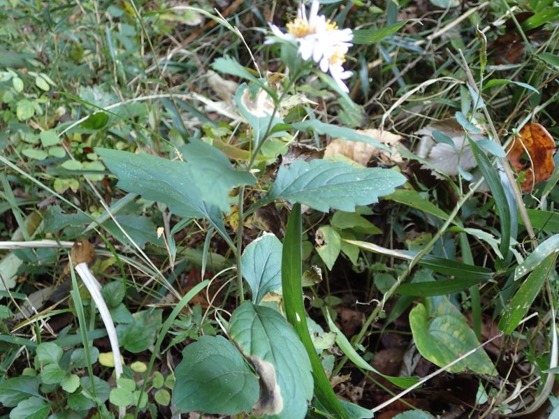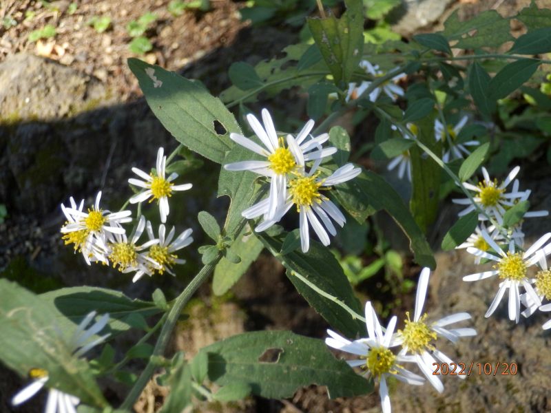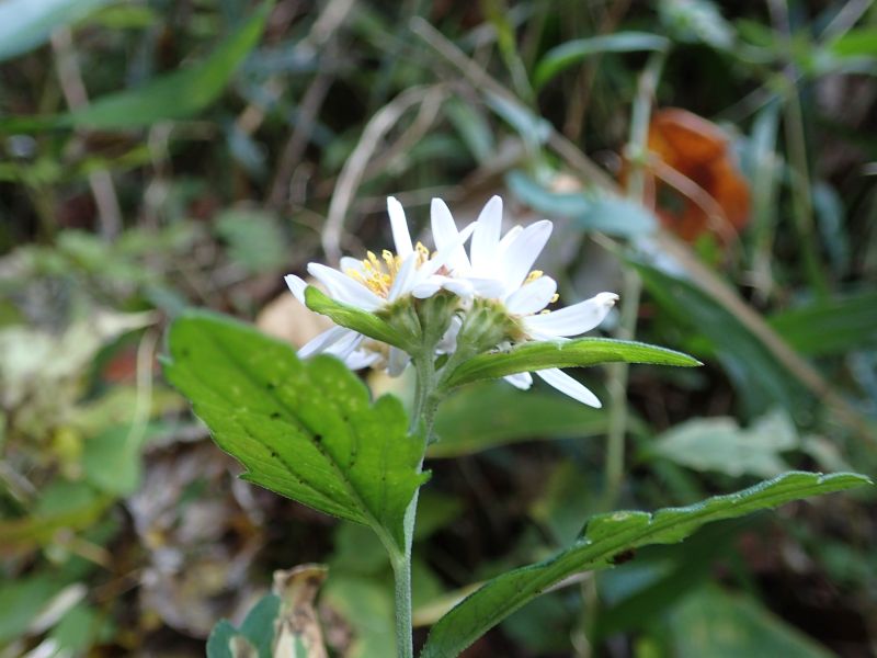 シラヤマギク:下葉は柄が長い心形、上葉は小さい被針形で、6〜8枚の白い舌状花が不等間隔に並び、筒状花は白っぽく、総苞片が3列に並ぶ。