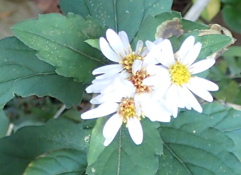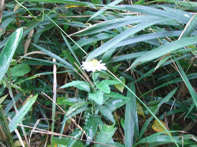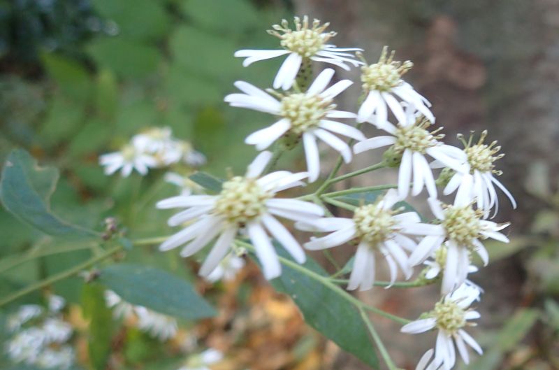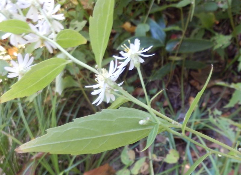 シロヨメナ:茎は直立し、葉は鋸歯のある長楕円状被針形で先がとがって光沢があり、基部はくさび形で、舌状花は白く総苞は筒状。