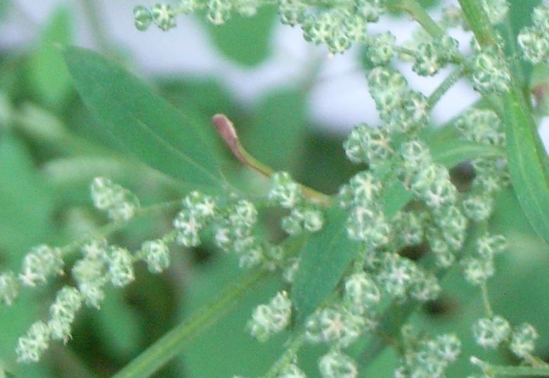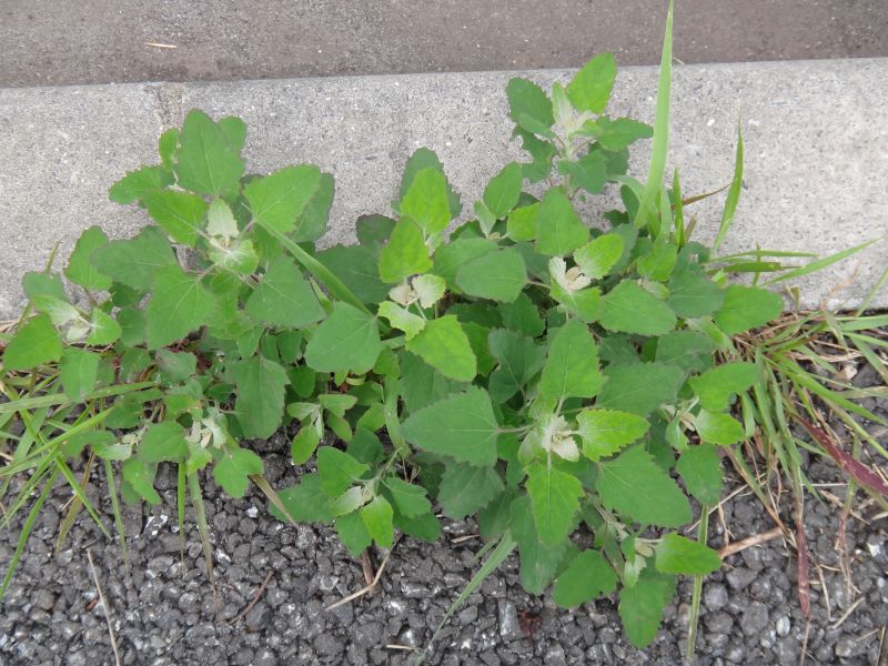 コアカザ:葉は長卵形でシロザより細くて下半部が浅く3裂し、種子に光沢がなく、花期は5月〜8月。
