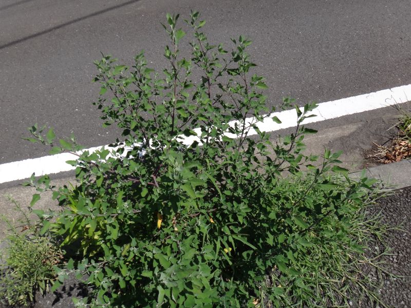 アカザ :葉は菱状卵形でシロザより大きくて付け根付近が赤く、種子に光沢があり、花期は5月〜10月。