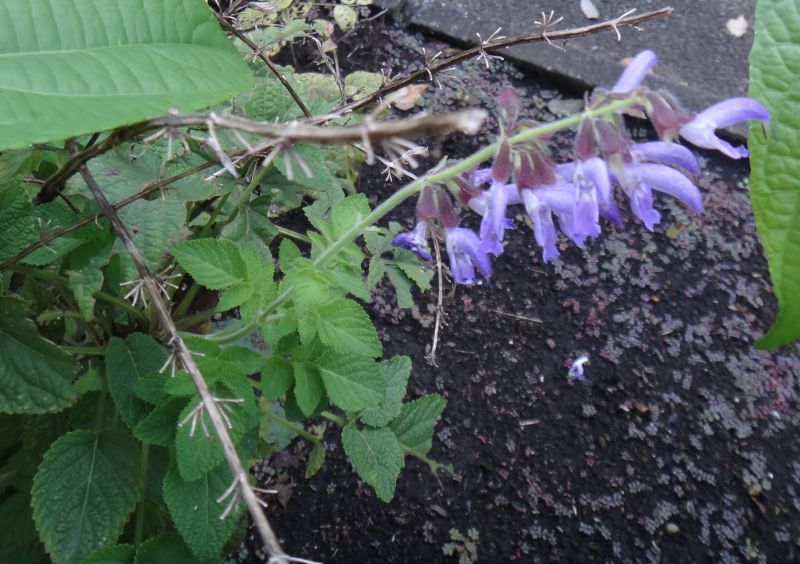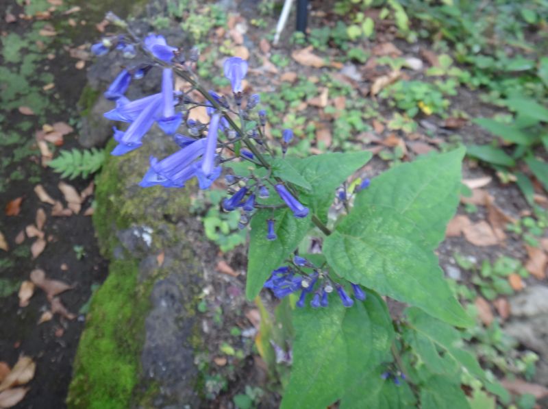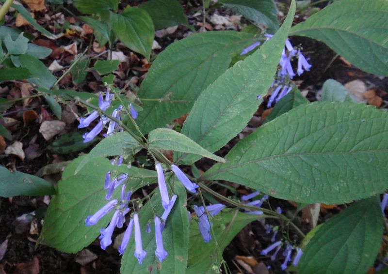 花柄の長い青紫色で細長い唇形花が総状にまばらに咲く