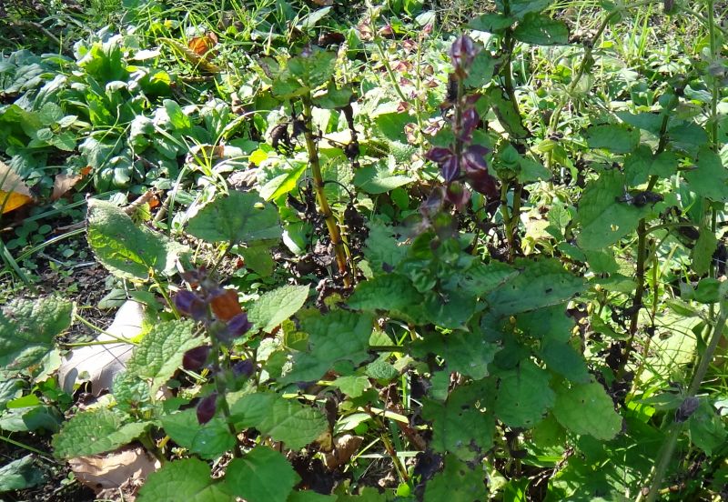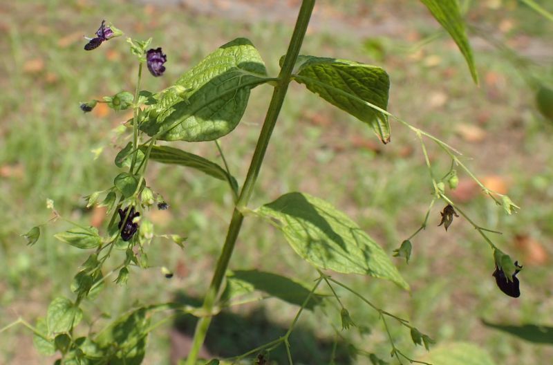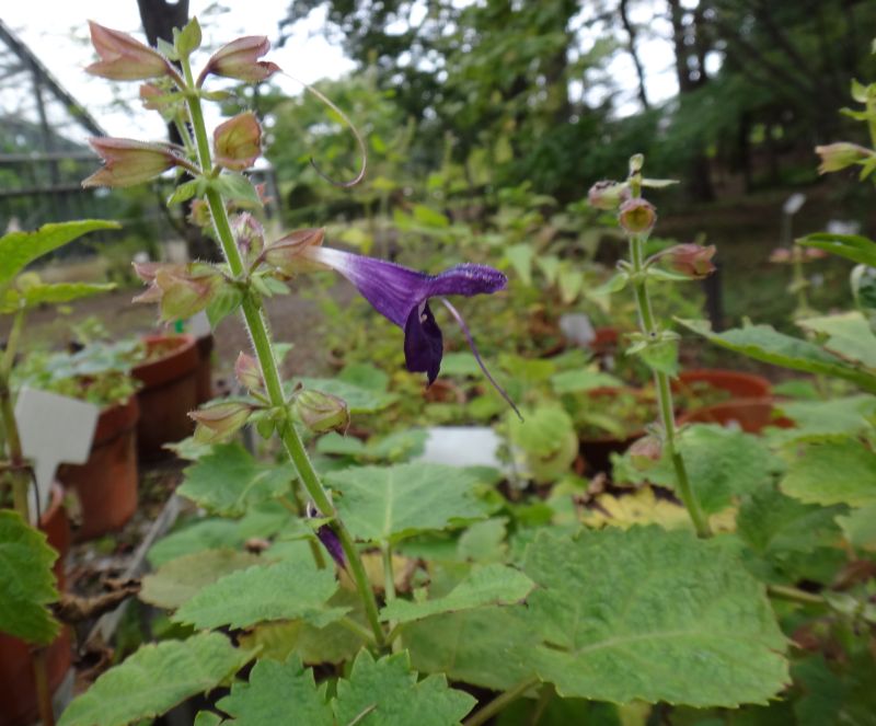 円錐花序に暗紫色の唇形の花をまばらにつける