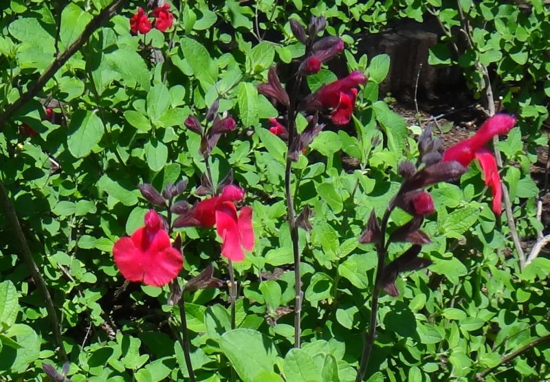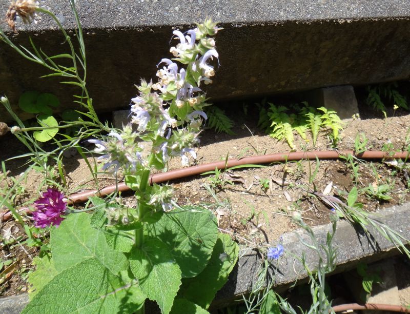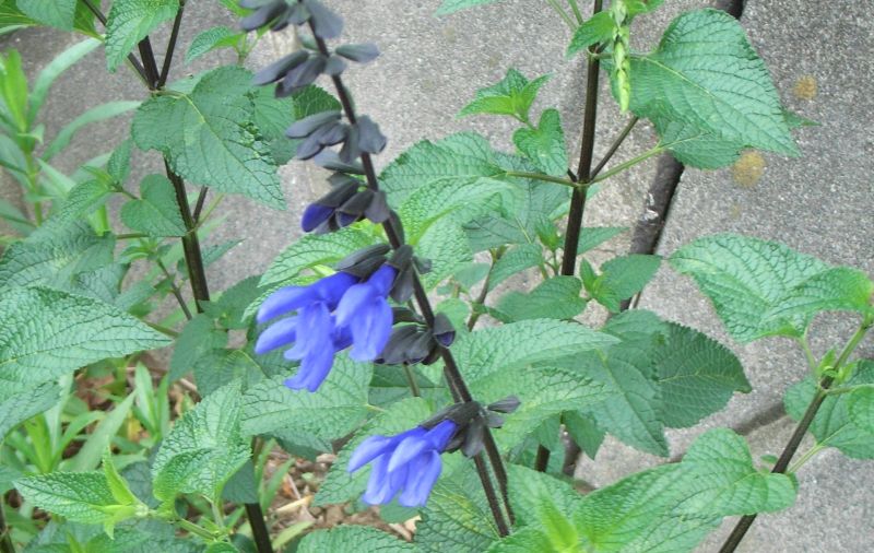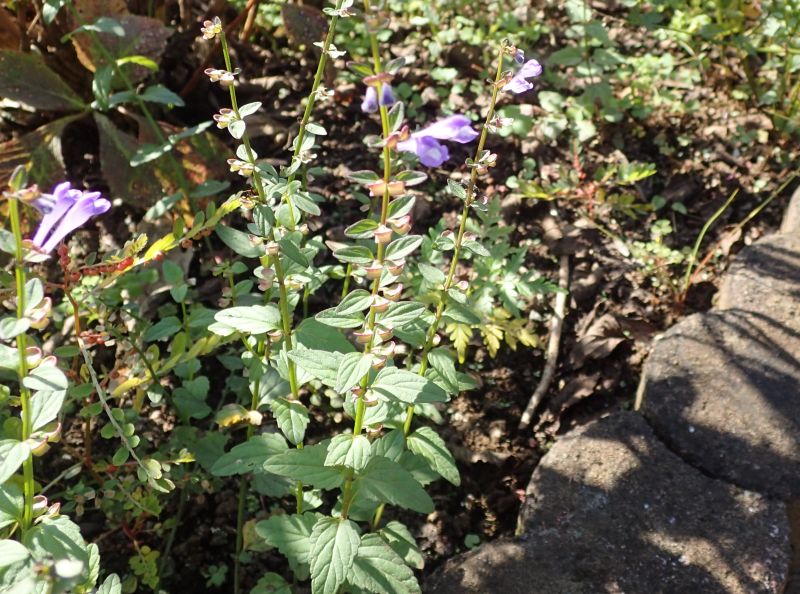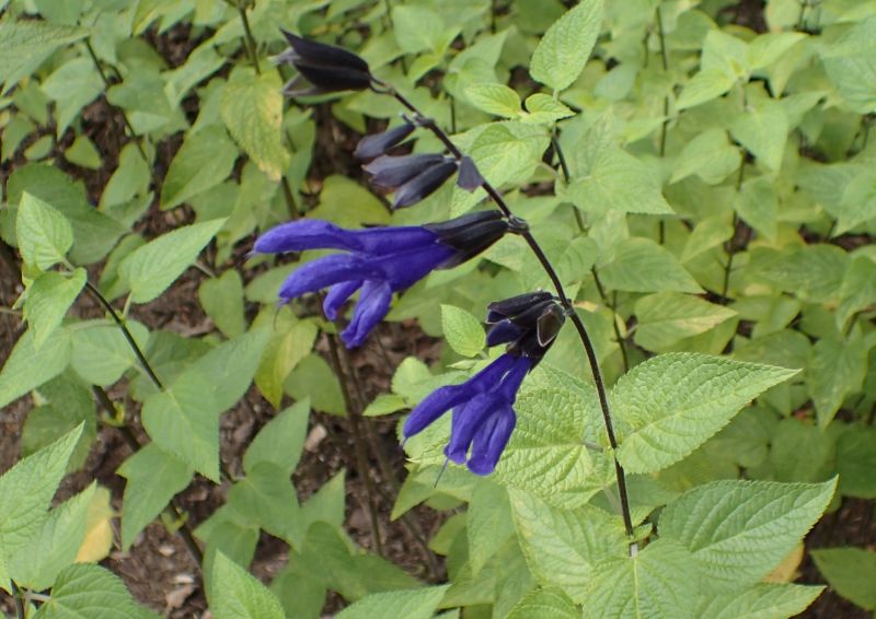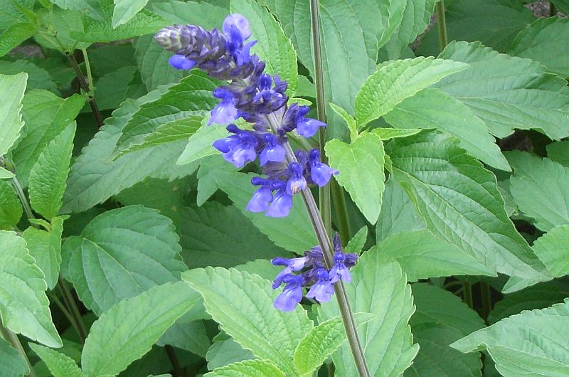 青紫色の唇形花の(輪生でない)集まりを花穂に多段につけ、