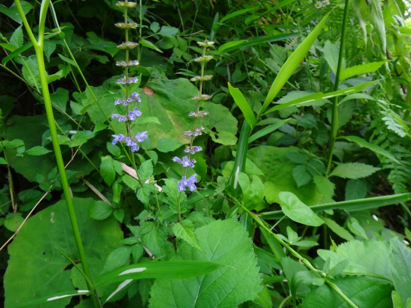 長い花茎を直立させ、青紫色の唇形の花を何段にも輪生させる