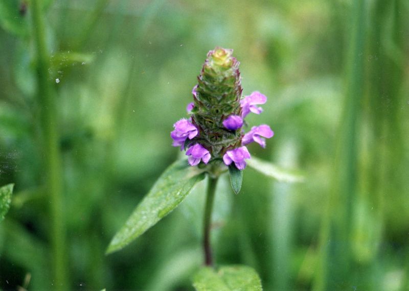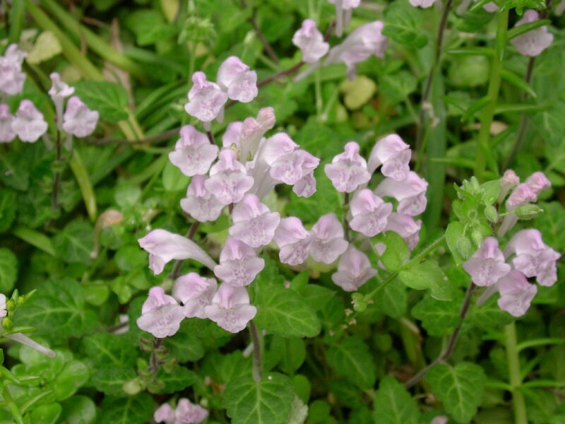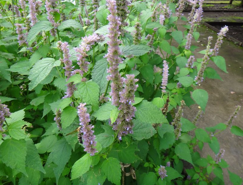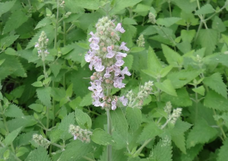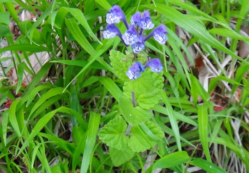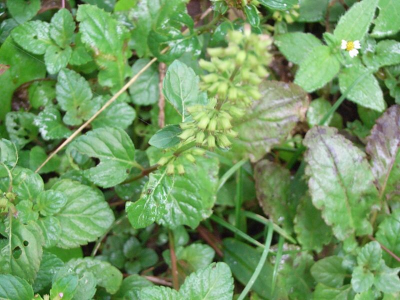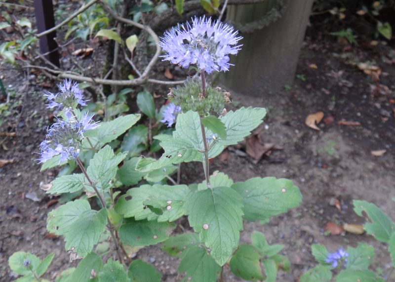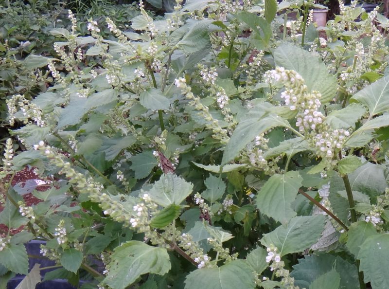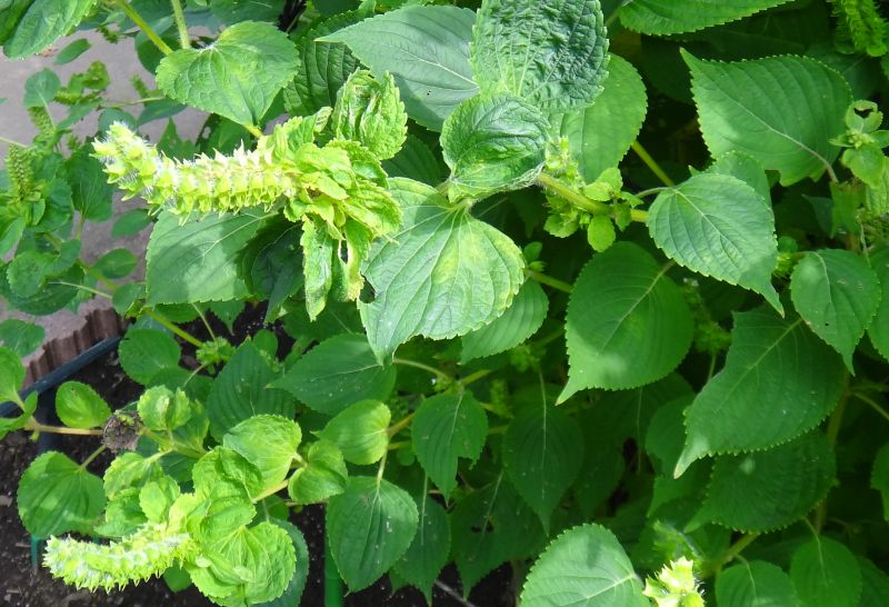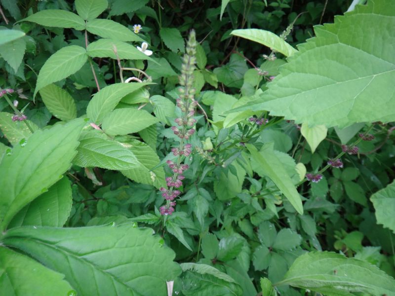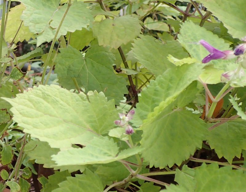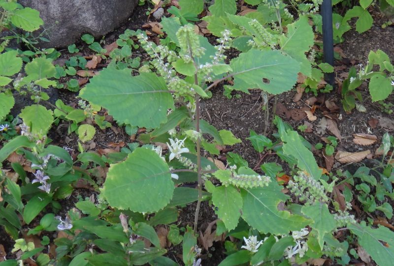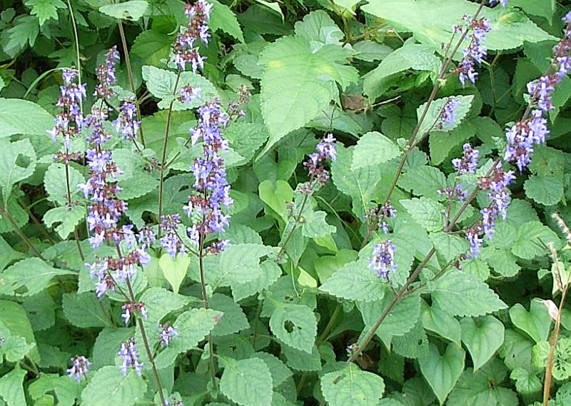 葉は広卵形で鈍鋸歯があり、穂状花序に淡青紫色の唇形花をつける