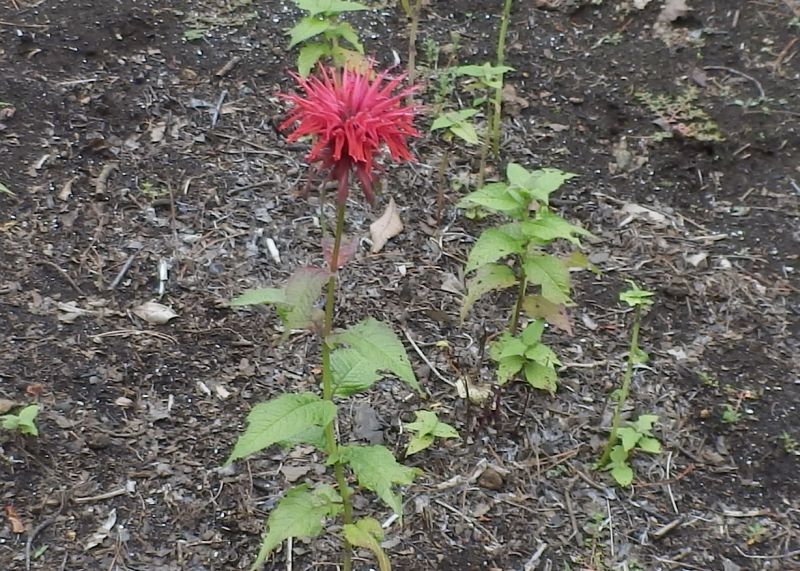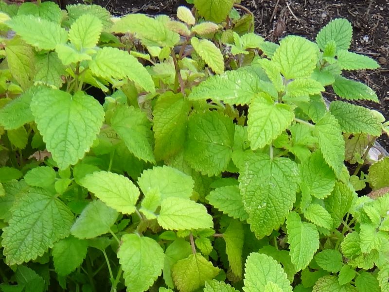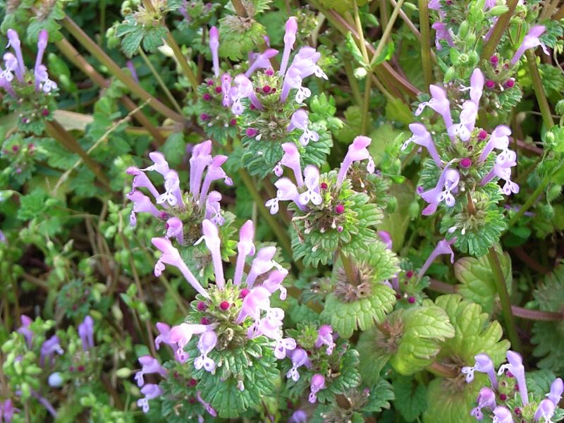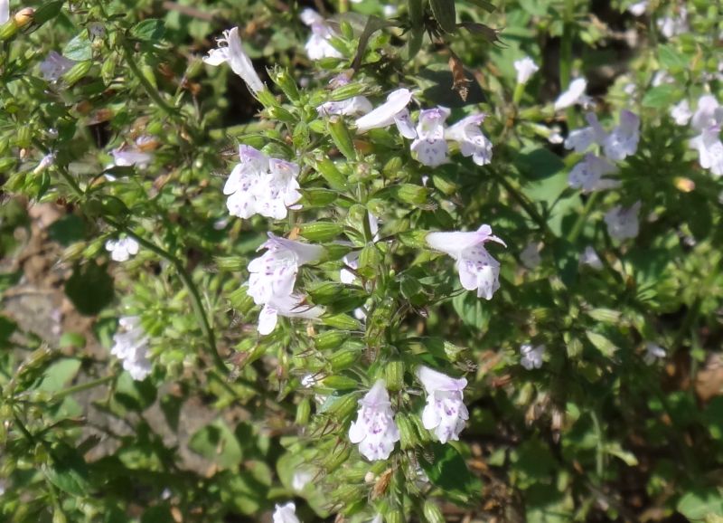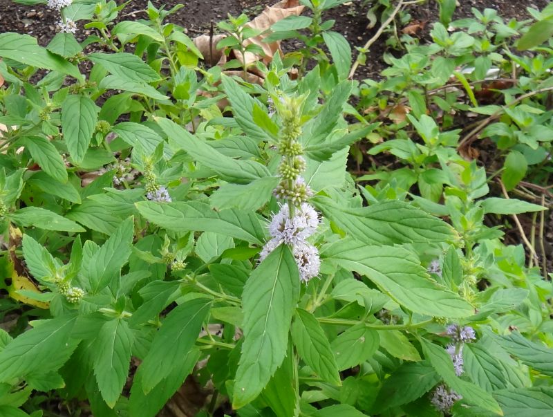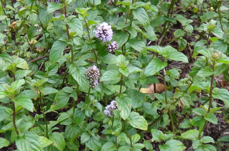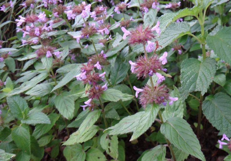 葉は卵形で、茎先と葉腋に淡紫色の唇形花が輪生状に咲く