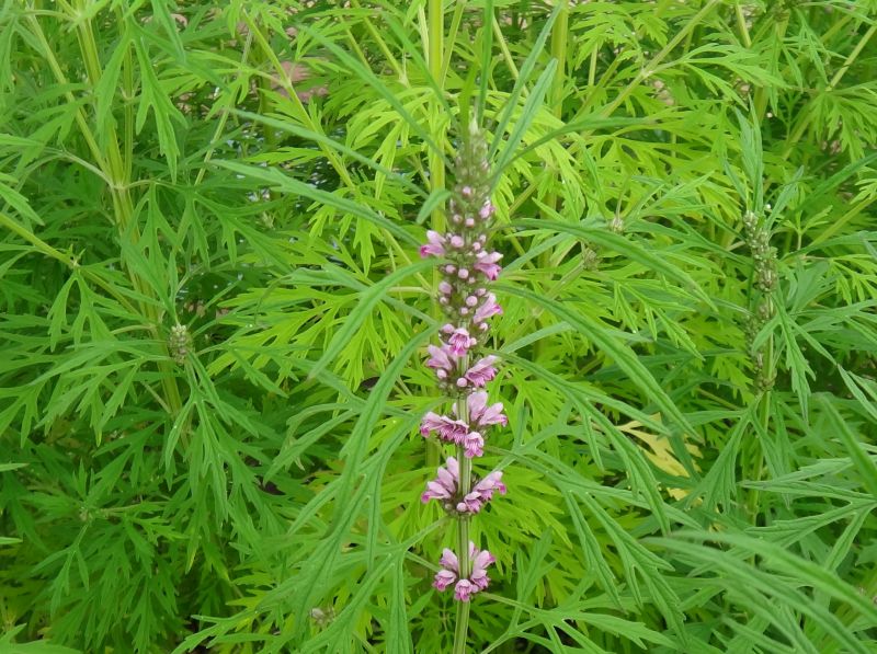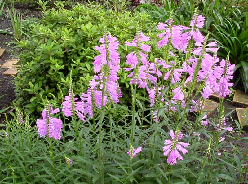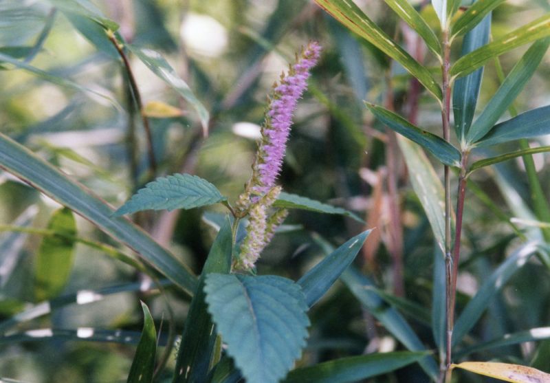 葉は披針形で鋸歯があり、花穂に淡紅色の唇形花が四角柱形に密集して咲く