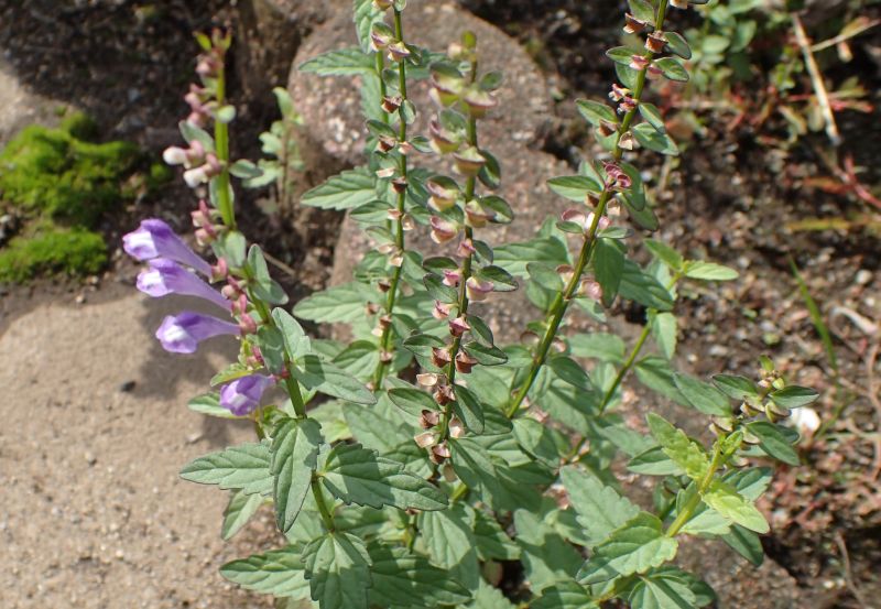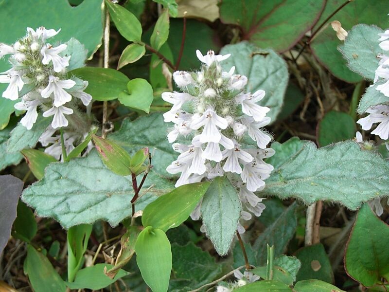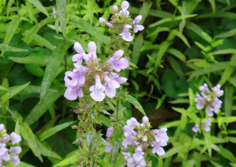 茎葉は倒披針形で白い毛がはえ、波状の鋸歯があり、花穂に唇形の花を多数つける