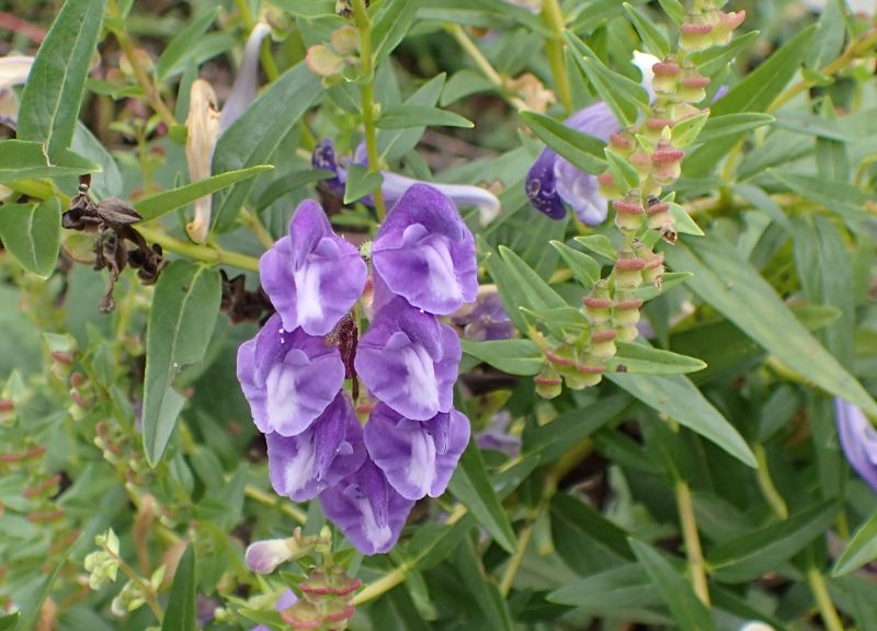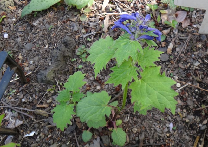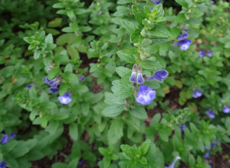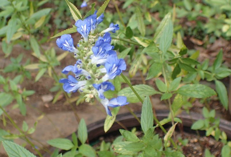 葉は長楕円形で鈍い鋸歯があり、葉腋に青紫色の2つの唇形花をつける